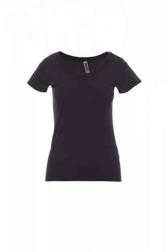 T-shirt manica corta sfiancata da donna con girocollo ampio, basso misto spandex da 1.2 cm, maniche corte, strette e cucitura laterale per una vestibilità più precisa, cuciture a due aghi su spalle eretro collo e nastratura in cotone.