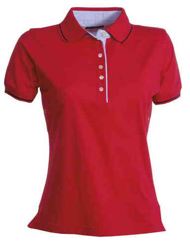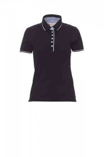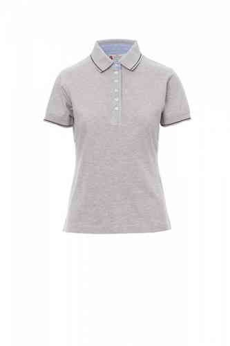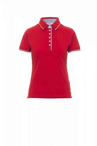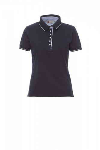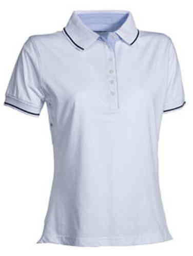 Polo donna sfiancata a manica corta a sei bottoni bianchi con interno collo, patta e spacchetti laterali in oxford celeste, colletto e bordo manica in rib con fine profilo a contrasto, occhielli sotto braccio, spacchetti laterali con cucitura di rinforzo,