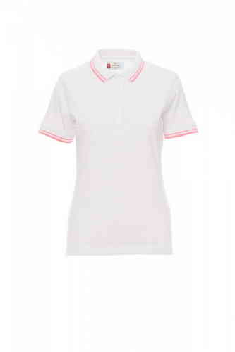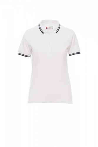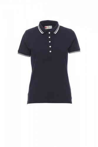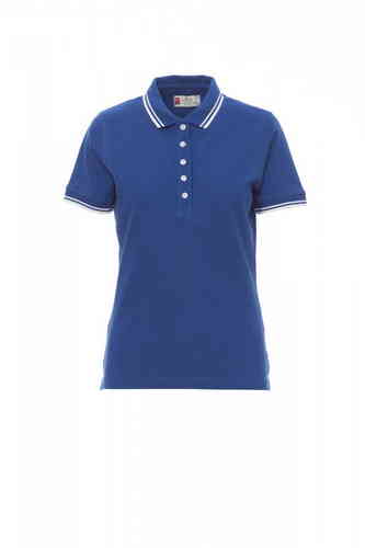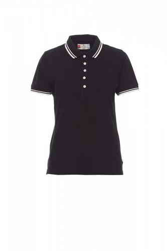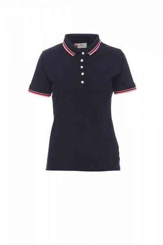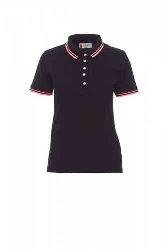 Polo donna sfiancata manica corta a cinque bottoni bianchi, collo e bordo manica con fine profilo a contrasto, colletto e bordo manica a costine, spacchetti laterali con cucitura di rinforzo, cuciture del collo coperte, nastro di rinforzo laterale, cucitu