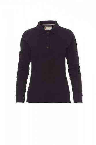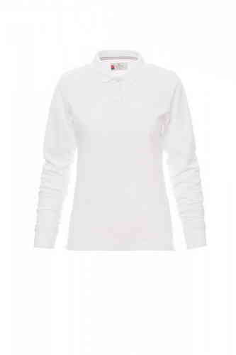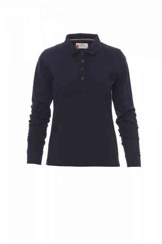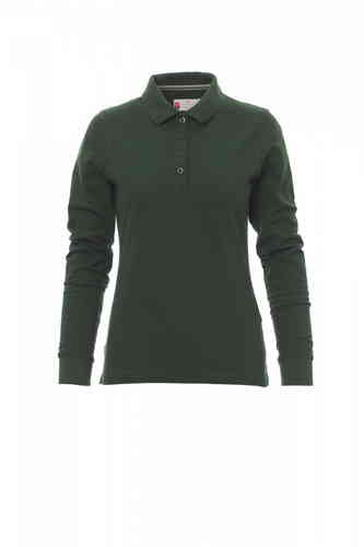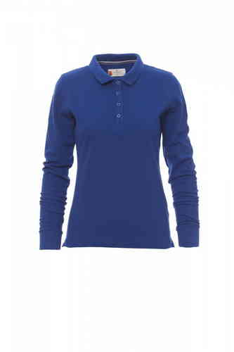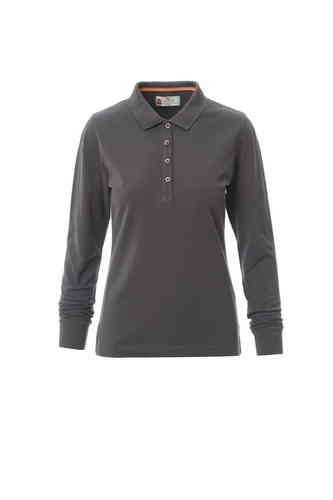 Polo sfiancata da donna manica lunga con 4 bottoni in tinta effetto perlato, colletto e bordo maniche a costine, spacchetti laterali, cuciture del collo coperte con nastro a contrasto, cuciture stretch, nastro di rinforzo laterale, rinforzo sagomato retro
