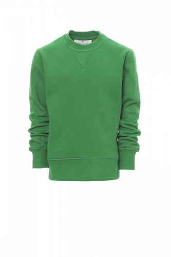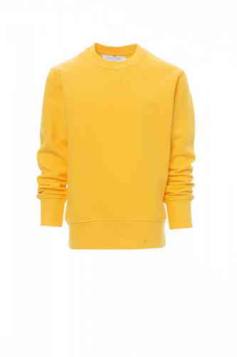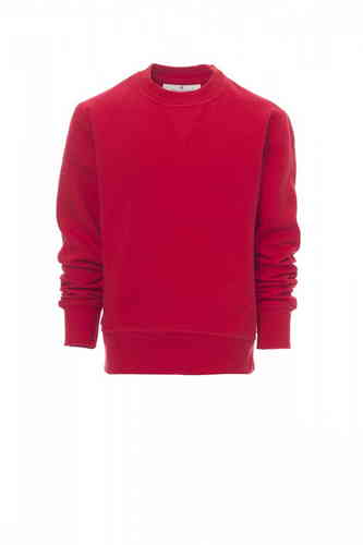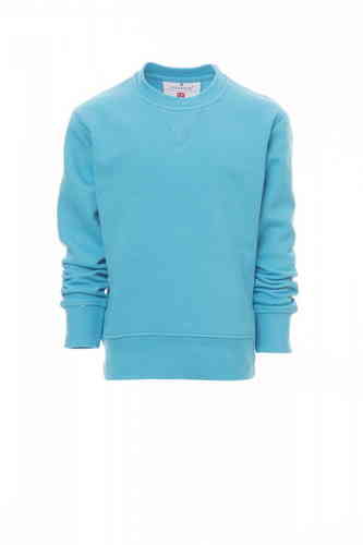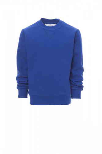 Felpa da bambino, girocollo, cucitura estetica a V al collo, manica a giro, polsini e vita in costina elasticizzata, cuciture rinforzate. 70% COTONE + 30% POLIESTERE GARZATA 280 GR/MQ