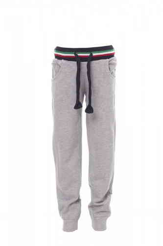 Pantalone bambino in felpa, rib elasticizzato in vita e a fondo gamba, coulisse in vita e due tasche frontali e un taschino, zip con patta. FRENCH TERRY 80% COTONE + 20% POLIESTERE 280 GR/MQ.