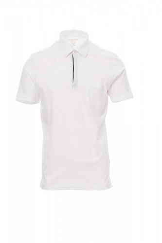 Polo manica corta a tre bottoni automatici a clips di metallo, apertura frontale del collo più fine e profonda, etichetta transfer, taschino lato cuore.