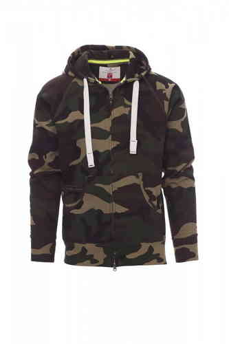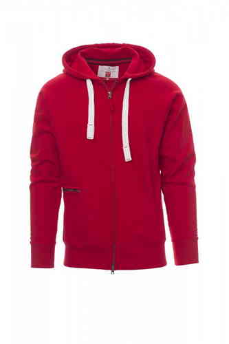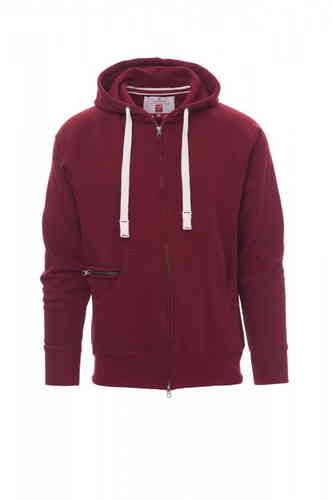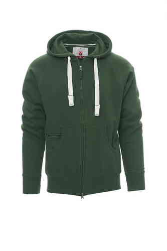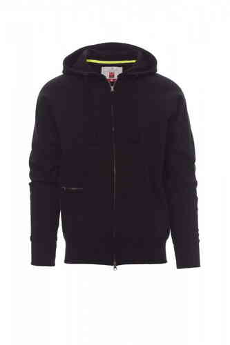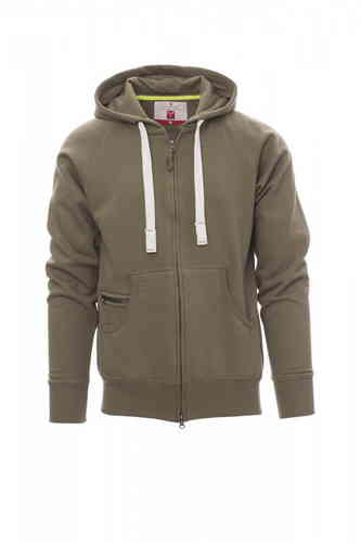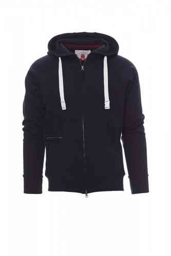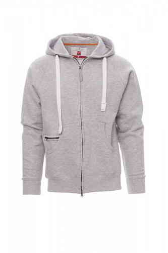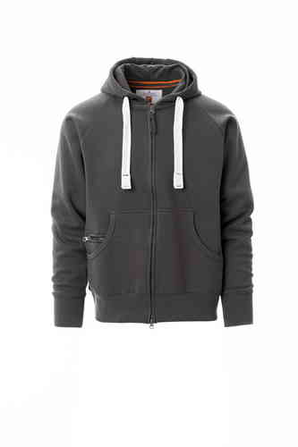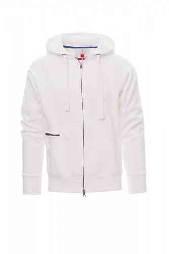 Felpa da uomo, zip intera SBS coperta, in plastica con doppio cursore in metallo, cappuccio con due cuciture, coulisse bianca in corda con cuciture in tinta con la felpa e anelle in metallo, manica raglan, tasche a marsupio con taschino con zip, polsini e