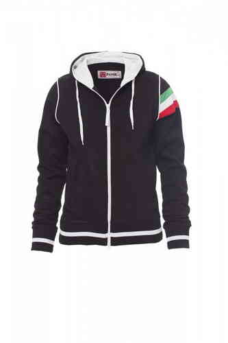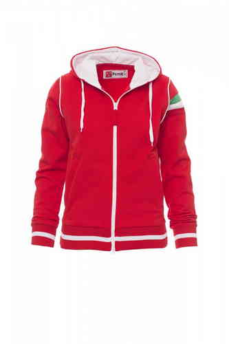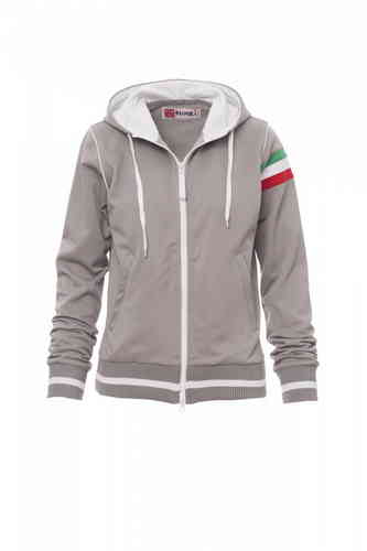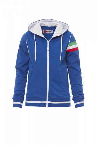 Felpa sfiancata da donna, zip intera in plastica a contrasto con doppio cursore in metallo, cappuccio con coulisse, interno cappuccio e coulisse in colore a contrasto, polsini e vita in costina elasticizzata con profili a contrasto, piping a contrasto nel