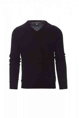 Maglioncino da uomo con scollo a V, lavorazione a punto rasato fine, confezione a maglia calata senza cuciture, costine fini per il bordino collo, per i polsi e i bordi inferiori.