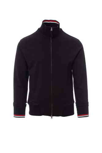 Felpa da uomo, zip intera coperta in plastica con doppio cursore easy zip in metallo. Vita, colletto e polsini in rib. Profili con righe a contrasto, due tasche laterali.