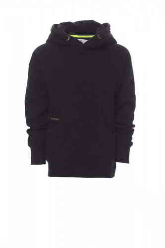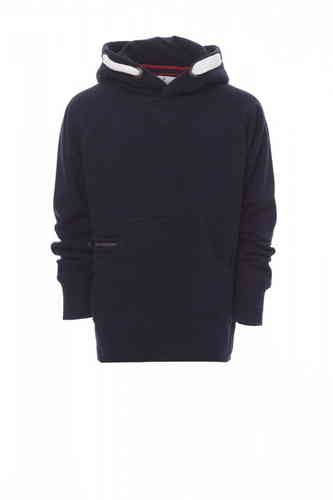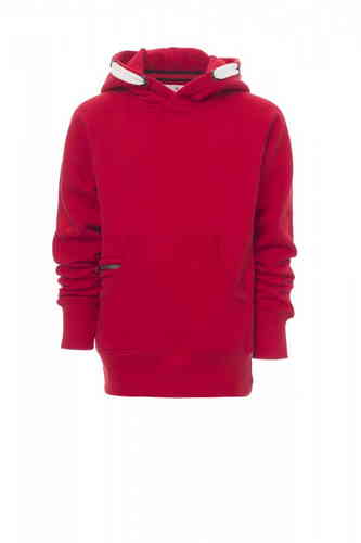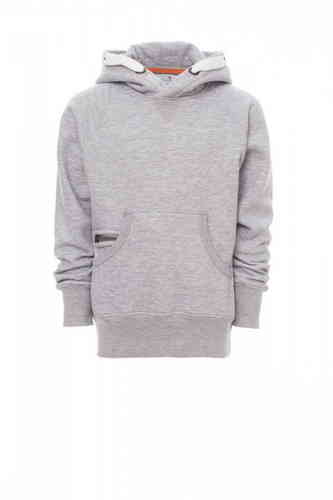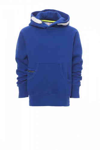 Felpa da bambino, cappuccio a due cuciture, coulisse bianca in corda con cuciture in tinta con la felpa richiusa con doppie anelle in metallo, manica raglan, cucitura estetica a V al collo, tasche a marsupio, taschino con zip, polsini e vita in costina el