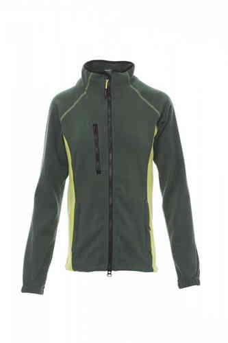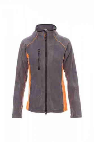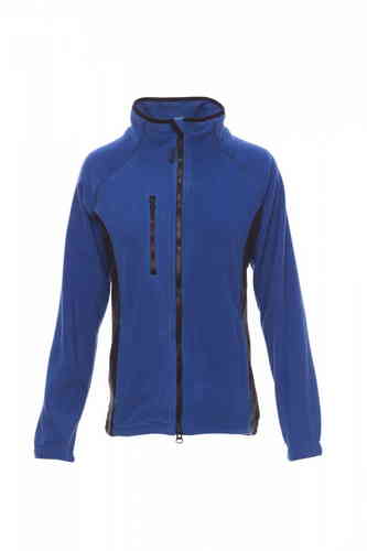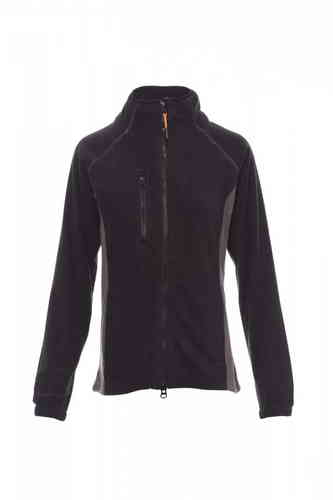 Pile bicolore sfiancato da donna, zip intera 8mm in plastica nera, manica raglan, coulisse regolabile in vita, elastici stringi polso, due tasche con zip coperte, una tasca frontale con zip, collo con bordatura di rinforzo in contrasto, cuciture rinforzat