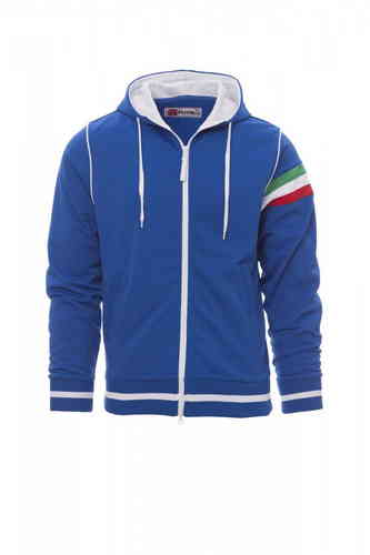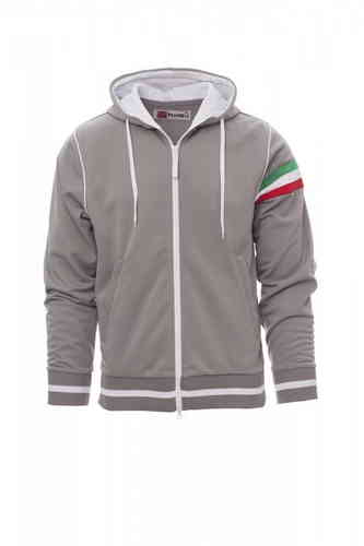 Felpa da uomo, zip intera in plastica a contrasto con doppio cursore in metallo, cappuccio con coulisse, interno cappuccio e coulisse in colore a contrasto, polsini e vita in costina elasticizzata con profili a contrasto, piping a contrasto nel giromanica