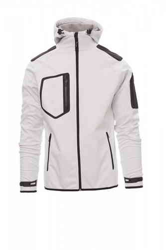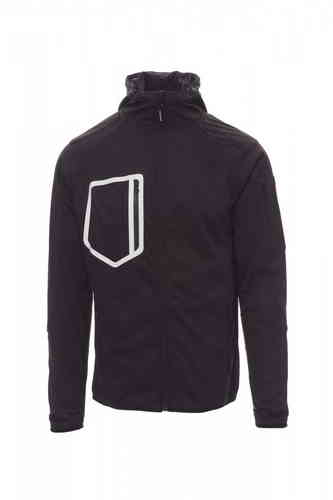 Giacca ergonomica da uomo, manica raglan, cappuccio sagomato con due cuciture e coulisse, zip lunga SBS nastrata, polsini regolabili con stringi polso gommati e velcro, fine bordino ai polsi e in vita, due tasche laterali con zip, una tasca al petto e una