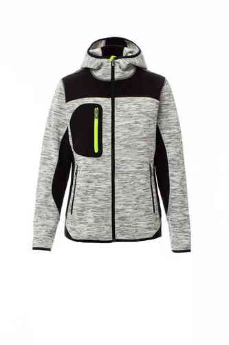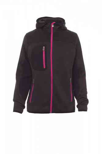 Giacca ergonomica da donna, zip lunga SBS nastrata, cappuccio sagomato con due cuciture, fine bordino ai polsi e in vita, due tasche laterali con zip, una tasca al petto. Lavorazione a maglia con inserti in sofshell nero.
