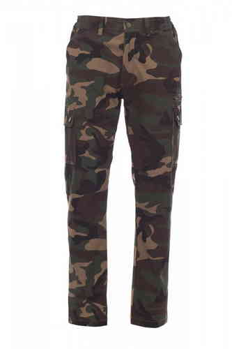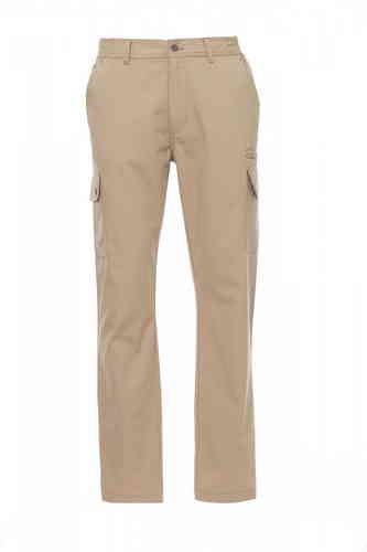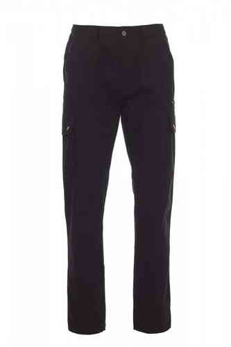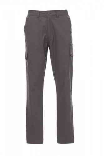 Pantalone uomo, estivo, elastici laterali e passanti in vita, chiusura con zip e bottone in metallo, due tasche anteriori a taglio classico, due tasche laterali con patta e bottoni automatici, una tasca con zip lato sinistro, un portametro a scomparsa lat