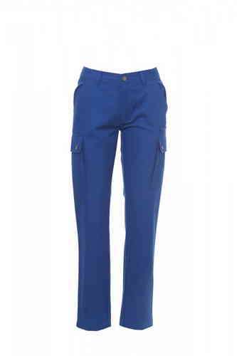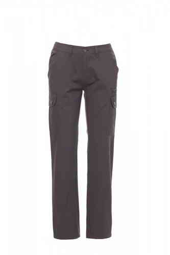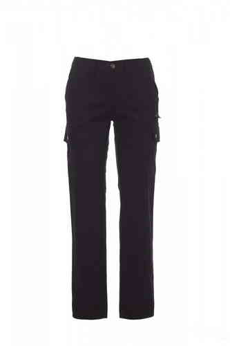 Pantalone donna, taglio classico, multistagione, elastici laterali e passanti in vita, chiusura con zip e bottone in metallo, due tasche anteriori a taglio classico, due tasche laterali con patta e bottoni automatici, una tasca con zip lato sinistro, un p