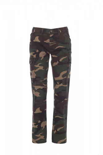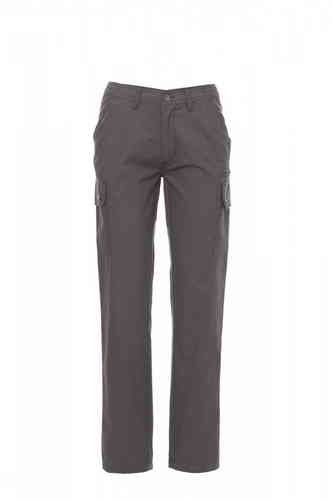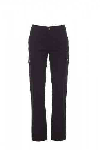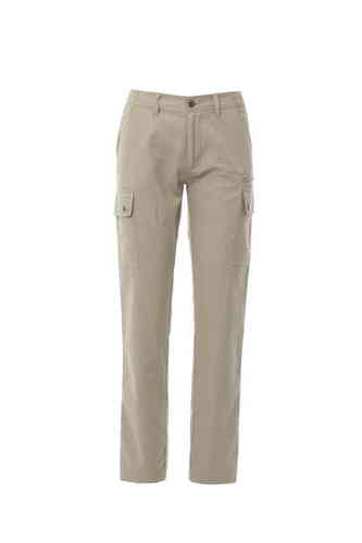 Pantalone donna, taglio classico, estivo, elastici laterali e passanti in vita, chiusura con zip e bottone in metallo, due tasche anteriori a taglio classico, due tasche laterali con patta e bottoni automatici, una tasca con zip lato sinistro, un portamet