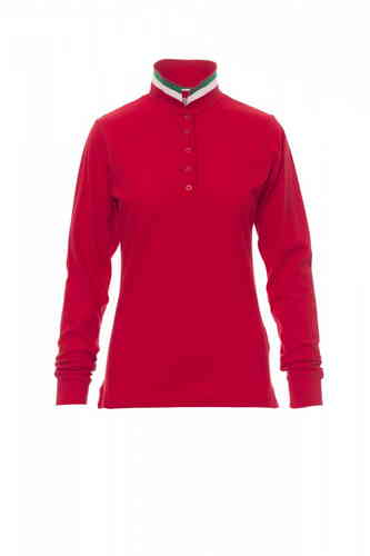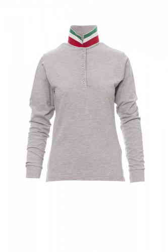 Polo sfiancata da donna manica lunga a cinque bottoni in tinta ad effetto perlato, colletto da un lato in tinta, dall'altro lato a contrasto tricolore, visibile solo se alzato, interno abbottonatura collo e spacchetti laterali con inserto tricolore, colle