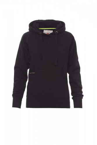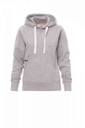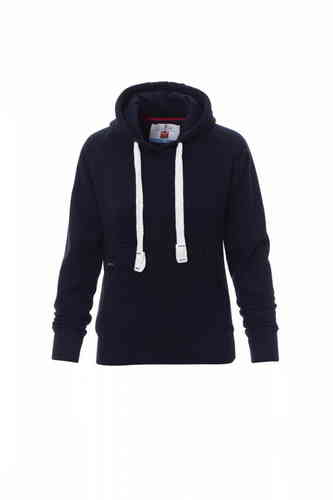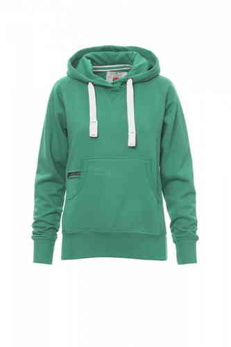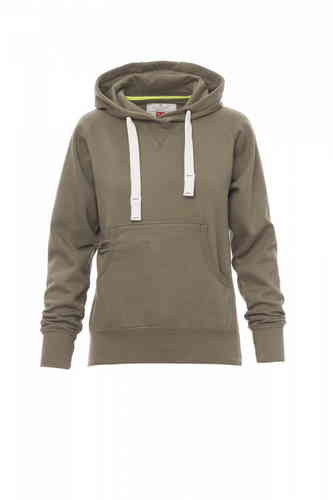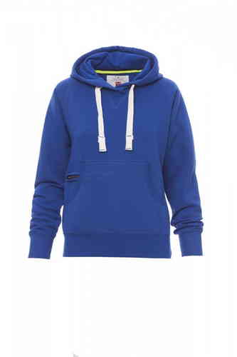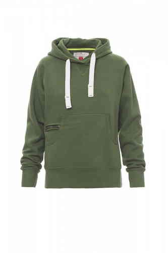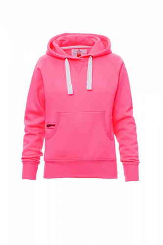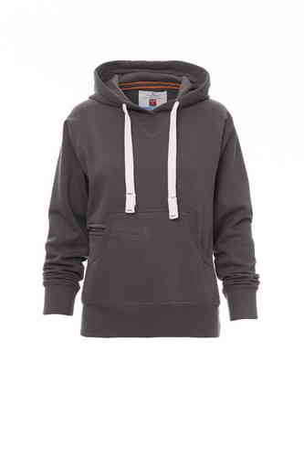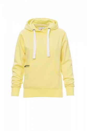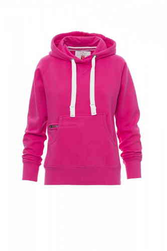 Felpa sfiancata da donna, cappuccio a due cuciture, coulisse bianca in corda con cuciture in tinta con la felpa e anelle in metallo, manica raglan, cucitura estetica a V al collo, tasche a marsupio, taschino con zip, polsini e vita in costina elasticizzat