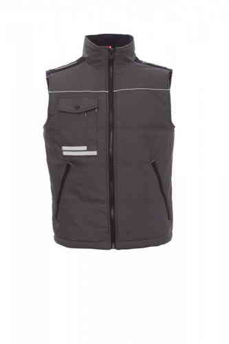 Gilet unisex, zip 8mm in plastica con cursore in metallo, retro sagomato, due ampie tasche esterne con zip, ampia tasca al petto multifunzione, porta smart-phone e bande riflettenti, anello porta badge. Interno: imbottitura trapuntata e rifinita con foder